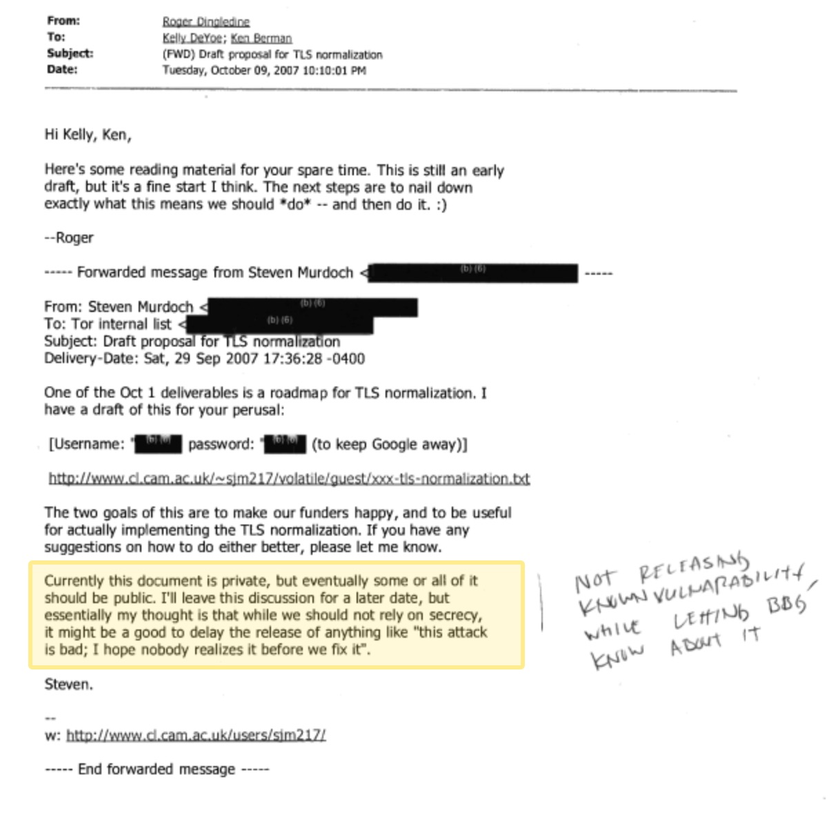 As CyberInsider reported, Tor developer Steven Murdoch discovered a vulnerability with the way Tor was handling TLS encryption. Roger Dingledine alerted two government agents about this vulnerability, before the general public. [1]
