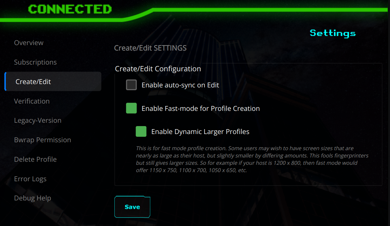 We are proud to present a new mode for quick profile creation, which when enabled presents many screen size options that are only slightly smaller than your host, in 50 dimension increments. When used in ‘fast mode’, it allows the user to effortlessly and conveniently get profiles that comfortably fill up their host’s display window, but each one is slightly different to fingerprinters.